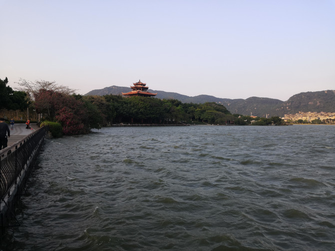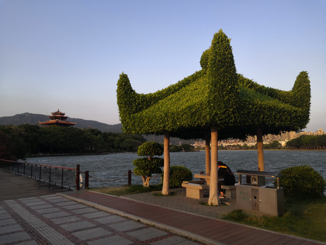 吃完饭大概5点来钟吧。觉得直接回酒店也没啥事儿干,顺路半道下车去了泉州的西湖公园。正好是看日落的时间。湖面比较开阔,傍晚沐浴着湖面上吹来的凉爽的小风,感觉十分舒服。这小西湖公园,既有一个像玉带桥的拱桥,又有一个像佛香阁的刺桐阁(刺桐是泉州的别称),还有一座17孔桥,所以它让我想到的不是杭州西湖,而是去过无数次的北京颐和园,感觉蛮亲切的。在刺桐阁附近坐了会儿。给妈拨通视频,分享这里小西湖刺桐阁美丽的日落景色。