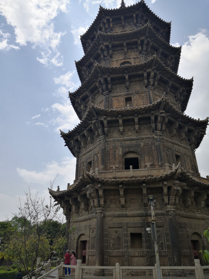 东西双塔——仁寿塔和镇国塔高耸入云,非常的醒目,几乎在寺院的每个角度都能看到其一。乍一看两个塔几乎是一样的。在我观望双塔时,碰巧有一位当地建委退休的八十多岁老专家正在此处做研究工作,我好奇地搭讪了几句,老先生热情回应,听了老先生的讲解,我才知道这两座石塔高度是不同的,这对普通游客来讲是很难看出其区别的。然后我坐下来从网上细查了一下双塔数据:东塔“镇国塔”,始建于唐咸通六年(865年),起初是建成五层木塔,前后经过几次毁坏与重修,南宋宝庆三年(1227年)改七级砖塔,今石塔为南宋嘉熙二年(1238年)至淳佑十年(1250年)间重建,高48.24米。镇国塔于1997年入选中国四大名塔邮票,可称得上石塔之王。西塔“仁寿塔”,始建于五代梁贞明二年(916年),初为七级木塔,称“无量寿塔”。北政和四年(1114年)奏请赐名“仁寿塔”,前后经毁坏与重修多次,至宋绍定元年至嘉熙元年(1228-1237年)由自证法师易砖为石,先于东塔十年建成。今石塔为南宋绍定元年(1228年)至嘉熙元年(1237年)重建,高44.06米,略低于东塔,其规模和形态与东塔几乎完全相同。