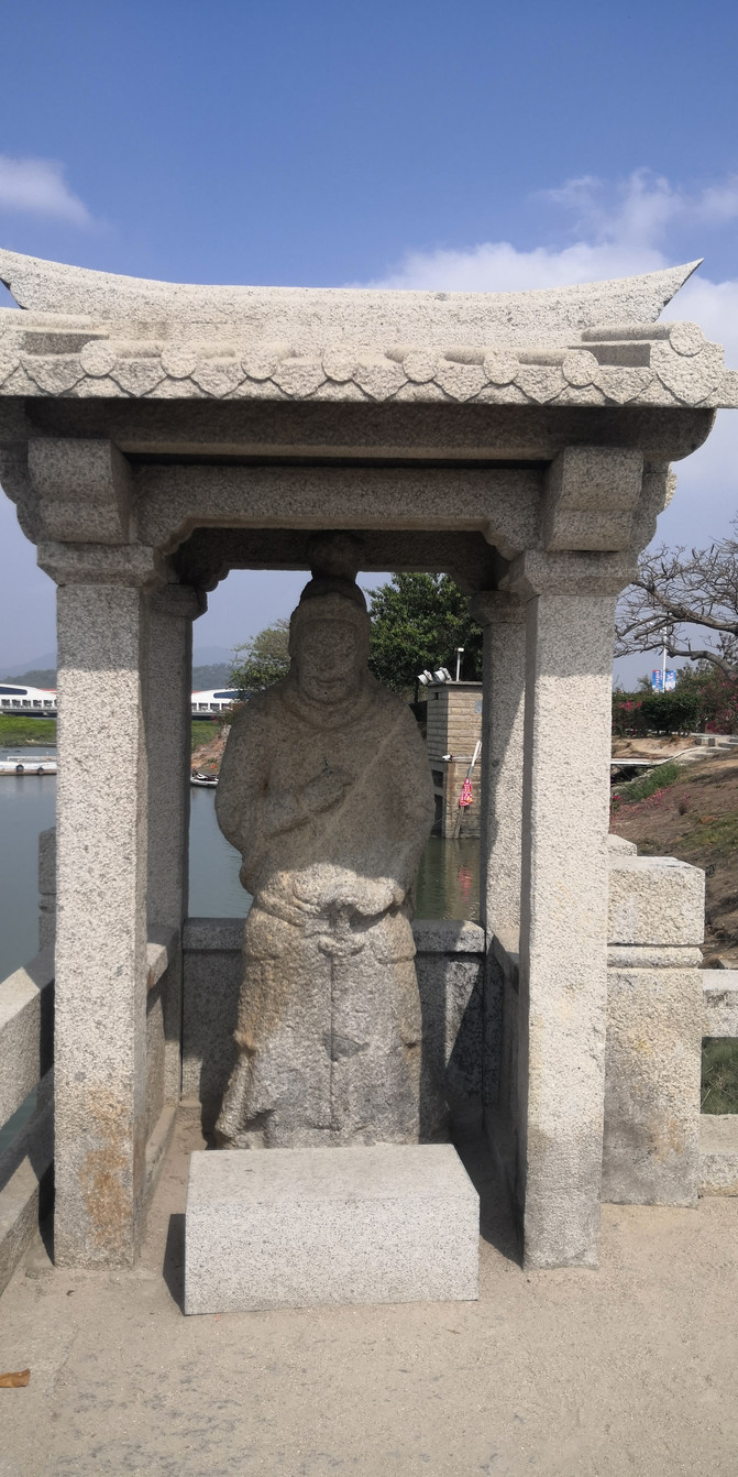 洛阳桥原名万安桥,它与北京的卢沟桥、河北的赵州桥、广东的广济桥并称为中国古代四大名桥,位于洛阳江入海口处,桥梁全长834米。这座桥的建造十分讲究,工艺不凡。桥头矗立着洛阳桥建造总指挥宋代名臣蔡襄的全身石像,高大伟岸,两座桥头矗立着多座石塔、多尊石刻将军像,桥南头竖立着很多历代石碑、摩崖石刻,记录了洛阳桥的历史以及这里往来过的文人和官客的轶事,这一切不仅让洛阳桥更显壮美,而且彰显了其承载的千年历史和文化的沉淀。宽阔的洛江上波光粼粼,再加上远远的江面上覆盖着的茂盛的厚厚的绿色植被与桥头的红花绿树交相呼应,为洛阳桥增添了怡人的浪漫色彩。