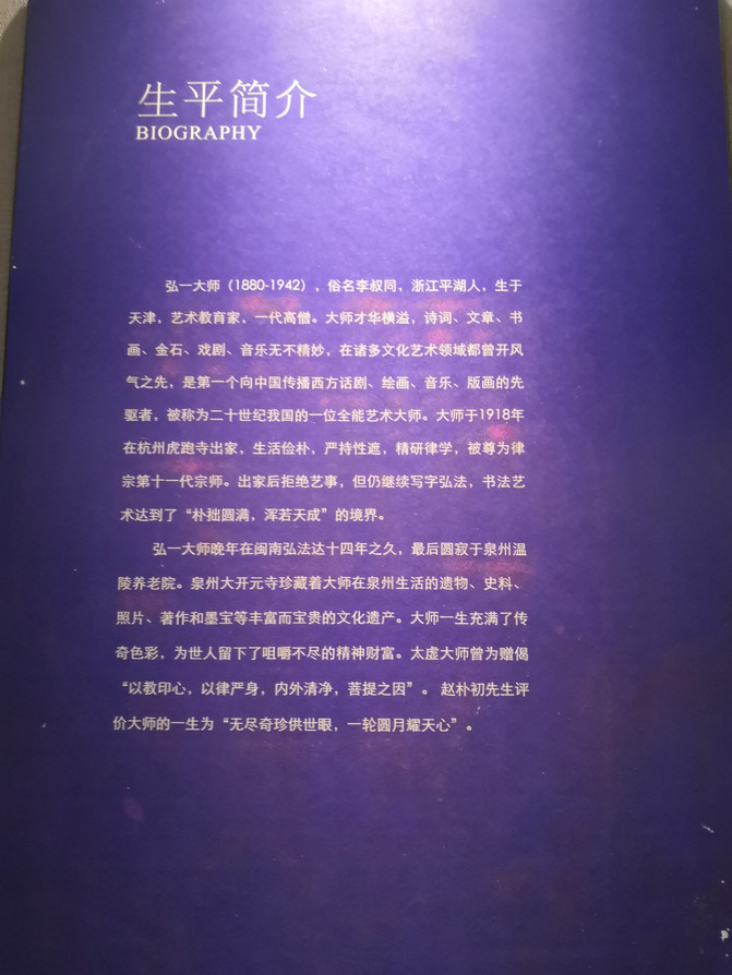古船博物馆旁边就是弘一法师纪念馆,介绍了李叔同从幼年读书学习、修炼才艺,到成年后多才多艺的职业生涯,再到皈依佛门、潜心修禅和最终留下“悲欣交集”四字而告别凡世的传奇一生。弘一法师李叔同的故事远远不是一首“长亭外,古道边。。。”所能够讲述清楚的,他的才华横溢实在是让人一言难尽,绝对是难得的风华才子、艺术大师和佛法大师!