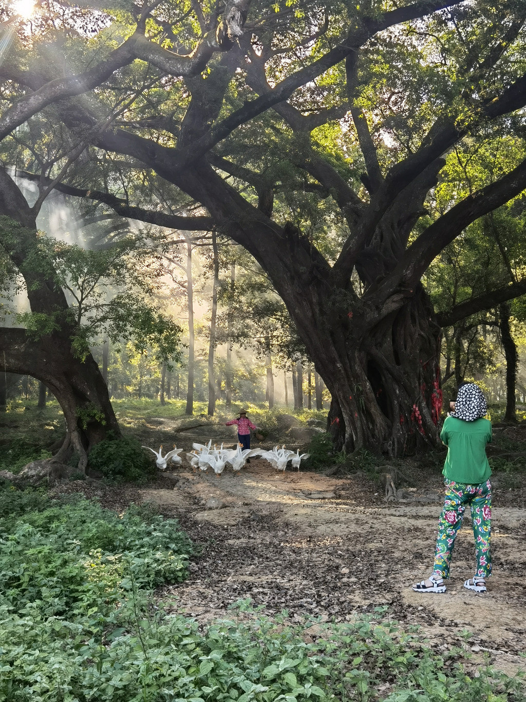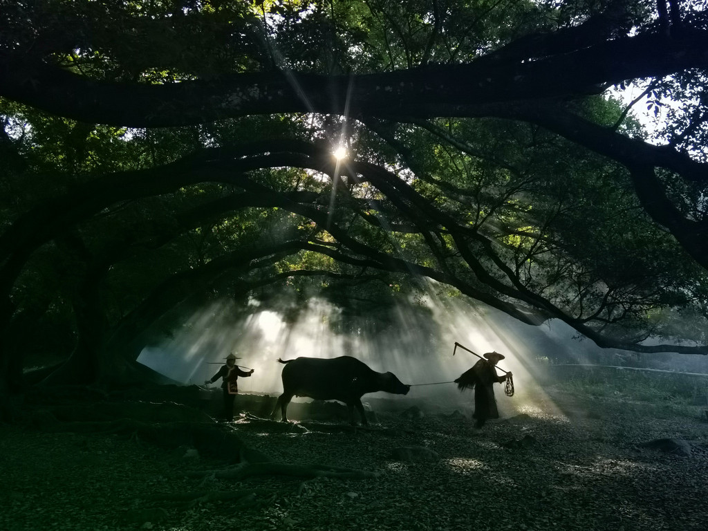 一位摄影师数年在拍拍拍,无意间拍到了在榕树下晨雾中走出的老农老牛,获得了大奖。于是这个场景就成了生意,带动了一个小景区,一个表演团队和几个周边民宿。蹭拍几乎没有可能