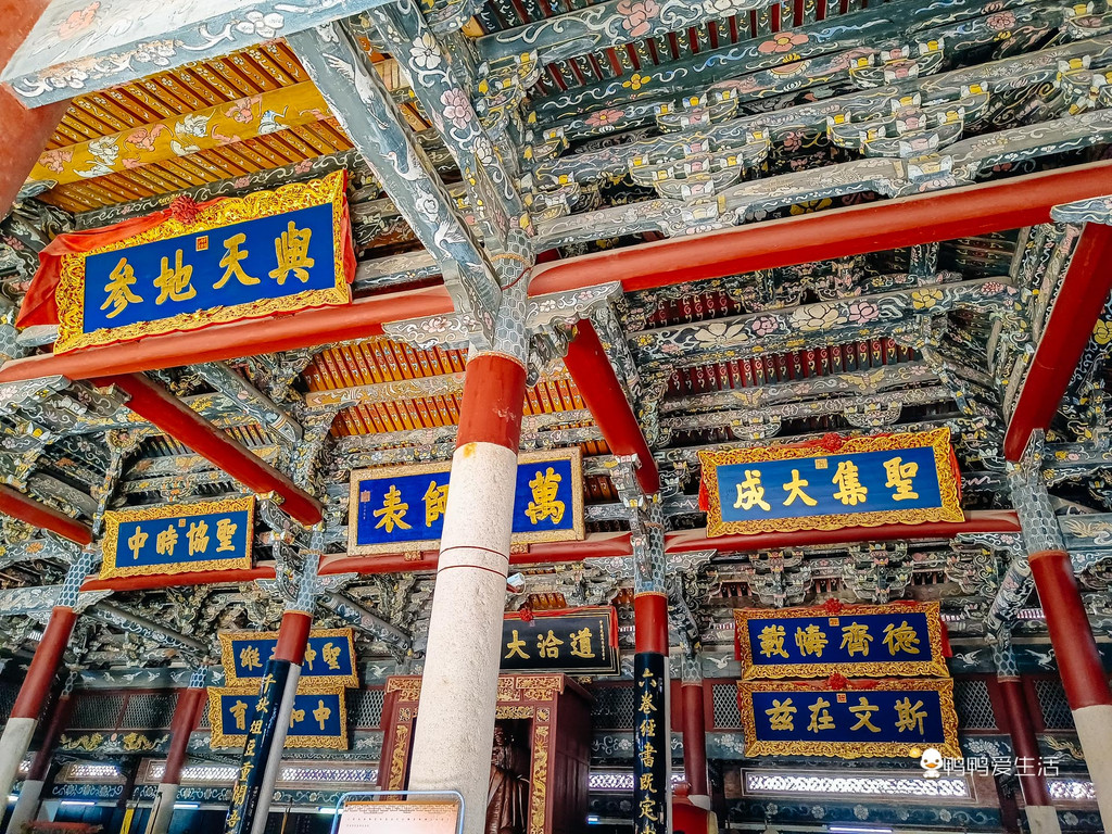 其中最值得看的是大成殿,重檐庑殿顶,面阔七间,进深五间,以四十八根石柱承托抬梁式木构架,正面六根檐柱浮雕蟠龙。进殿后抬头看,通殿彩绘,重檐庑殿式结构是泉州目前惟一存在的这种建筑结构,这种结构代表了当时最高建筑规格,蔚为壮观!