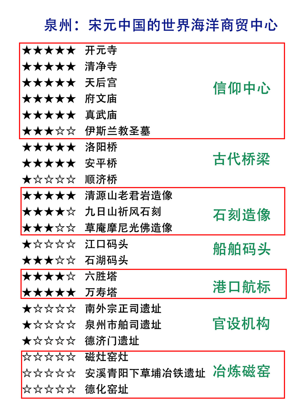 宋元时期,泉州是当时整个东方最大的港口城市,与当时西方的亚历山大港并称,如果等量比较的话,其地位就如同现在的上海港、宁波港,乃至更甚。宋朝极其重视海洋贸易事业,而对外贸易也是当时朝廷最主要的收入来源,这在国内的历史上是绝无仅有的,外贸的繁荣也带动了一大批巨大港口。22个遗产要素中的两大船舶码头(江口码头、石湖码头)、两个港口航标(万寿塔、六胜塔),三大官设机构遗址(南外宗正司遗址、泉州市舶司遗址、德济门遗址)就见证了当年的繁华。