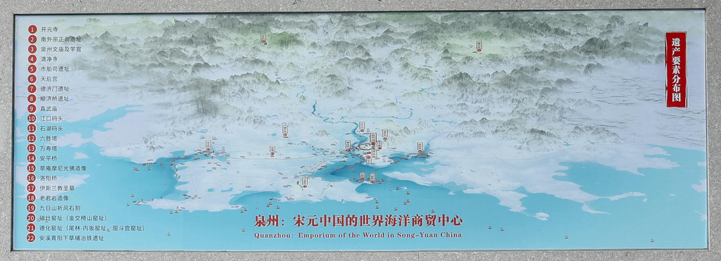 2021年,“泉州:宋元中国的世界海洋商贸中心”申遗成功,成为中国第56项世界遗产,也是国内世遗大家庭中“最年轻”成员。总共有22个遗产要素,分布于以今天泉州城区为核心的泉州湾地区,包括九日山祈风石刻、市舶司遗址、德济门遗址、天后宫、真武庙、南外宗正司遗址、泉州府文庙、开元寺、老君岩造像、清净寺、伊斯兰教圣墓、草庵摩尼光佛造像、磁灶窑址(金交椅山窑址)、德化窑址(尾林—内坂窑址、屈斗宫窑址)、安溪青阳下草埔冶铁遗址、洛阳桥、安平桥、顺济桥遗址、江口码头、石湖码头、六胜塔、万寿塔22个遗产点,涵盖了社会结构、行政制度、交通、生产和商贸诸多重要文化元素。这些遗产点具有鲜明的海上贸易和东西方文明交融特征,古老、生动,甚至世所罕见,见证了“刺桐”这座古代东方大港的地位、奉献和风韵。