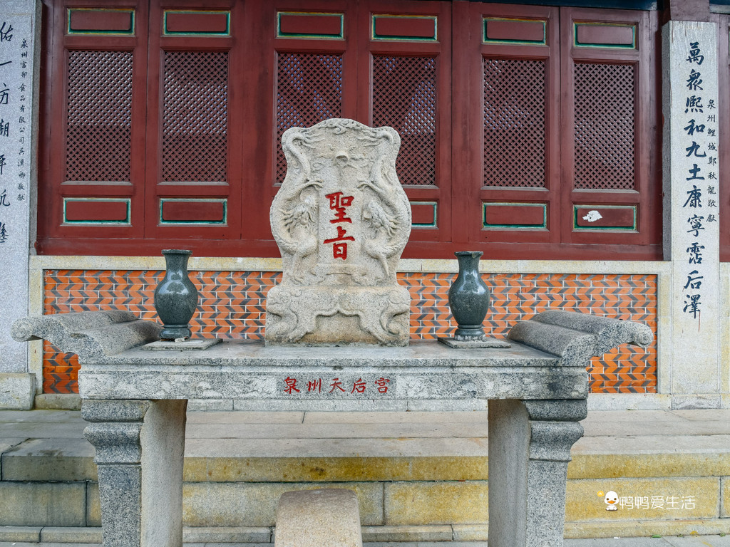 大殿后面乃是寝殿,如今作为展示厅,展览有天后宫保存的重要文物(里面禁止拍摄),值得细细一品。殿前檐柱保存一对十六面青石雕的元代印度教寺石柱。