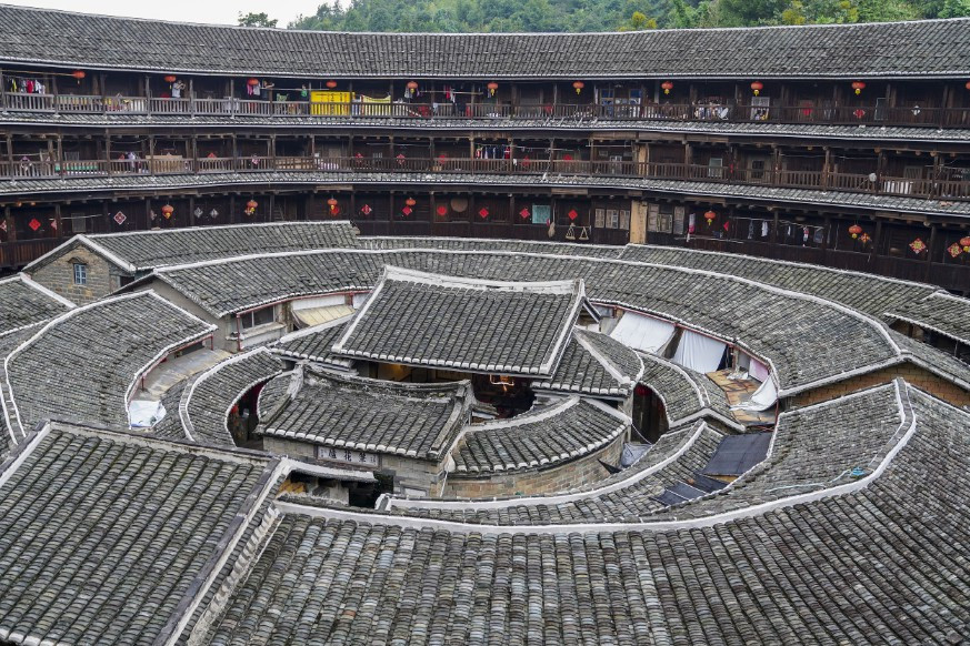 田螺坑土楼群:客家土楼群典范,俗称“四菜一汤”,建筑学家盛赞“俯视宛如花,旁看布达拉”。