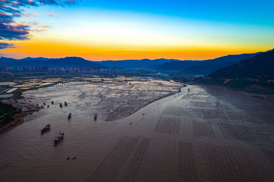 北岐滩涂:霞浦滩涂1号拍摄点,最具特色的是虎皮样的滩涂斑纹和满滩满海的竿影、人影和船影,富有韵律美和动态美。