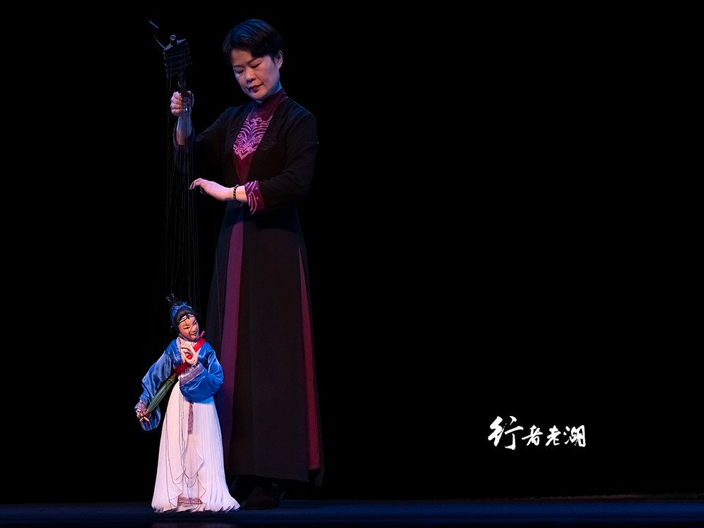 木偶戏演出开始了,第一个上场的是《小沙弥下山》。小沙弥背着木鱼出场,憨态可掬,步履轻盈灵动,如行云流水。木偶操作的细节颇为到位,小沙弥脚步前脚踏地,后脚脚尖落地,最难得的是,演员(操控者)的表情和步伐与木偶配合到人偶合一的境界。