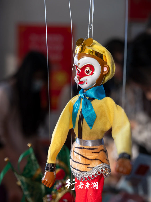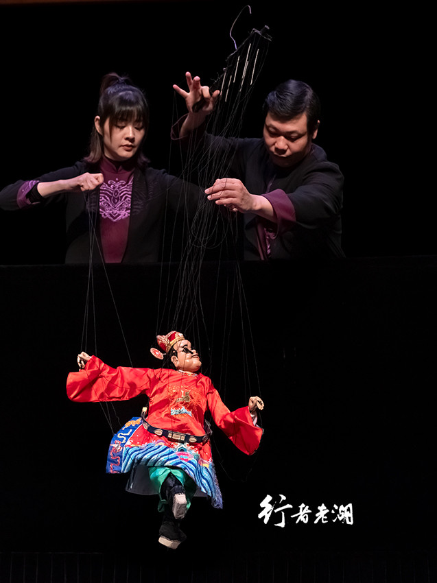 多人联手提丝的《闹元宵》是压轴戏。两位演员提着小县令出场,两人四手配合默契,动作迅速而不乱,木偶惟妙惟肖。据说泉州提线木偶一般有16根线,最多有30多根,复杂程度不得不对非遗技艺刮目相看。