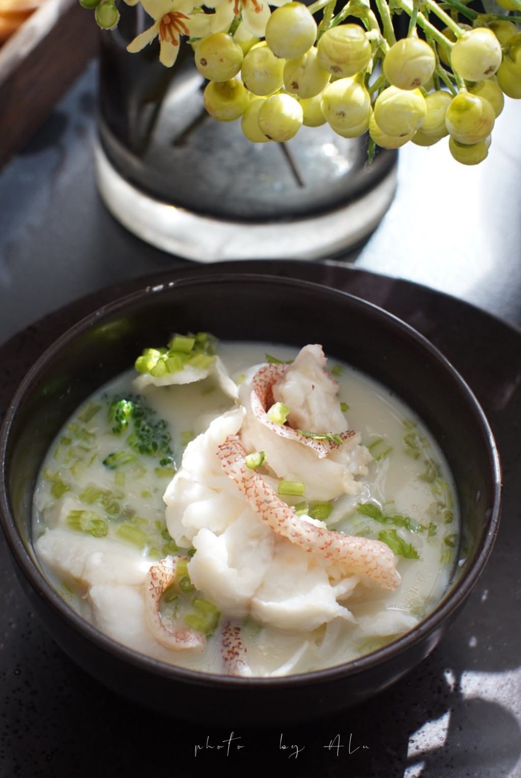 琼浆堂灼东星斑更是满满的仪式感,东星斑整条片好,现场堂灼,在乳黄色的豆浆汤底中依次放入鱼头、鱼尾,搭配好的菌菇时蔬,待其熟成后放入鱼片汆汤至鱼肉打卷,在淋入豆浆,撒上香芹碎,菌鲜鱼嫩,汤鲜味美,让人忍不住称赞。