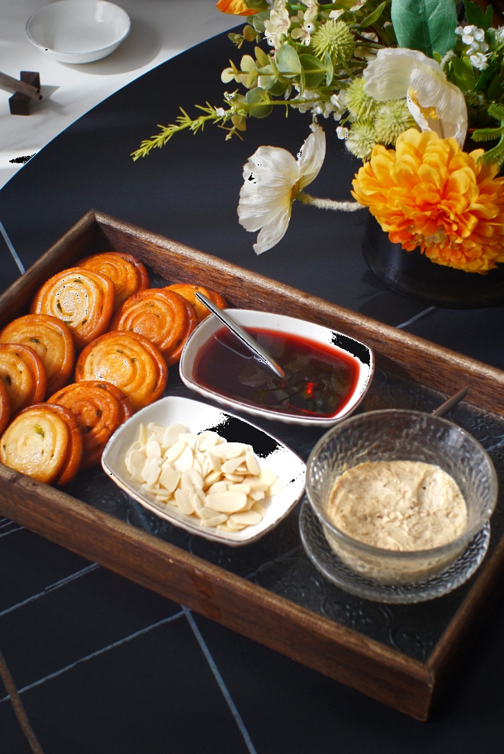 鹅肝坚果配葱油饼,煎得焦香的葱油饼,抹上丝滑的鹅肝酱,慕斯的口感入口即化,放上香脆的杏仁片,淋上蓝莓酱,很有想法也有层次,应该算是中西结合的一道甜点,个人而言,我很爱它。