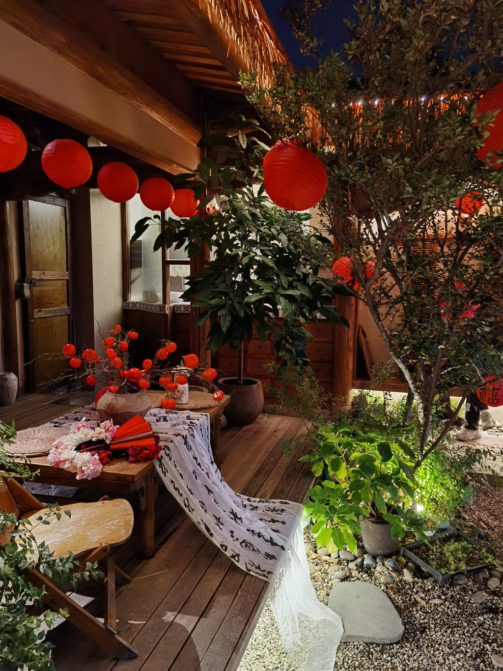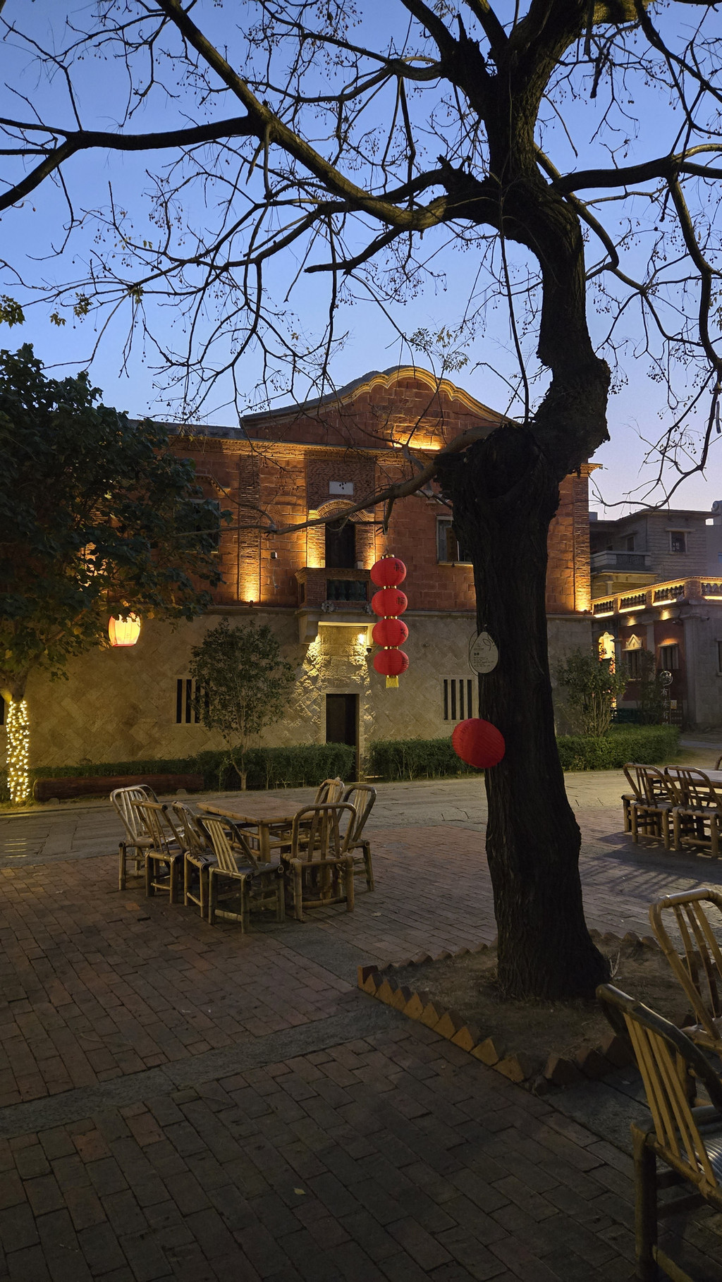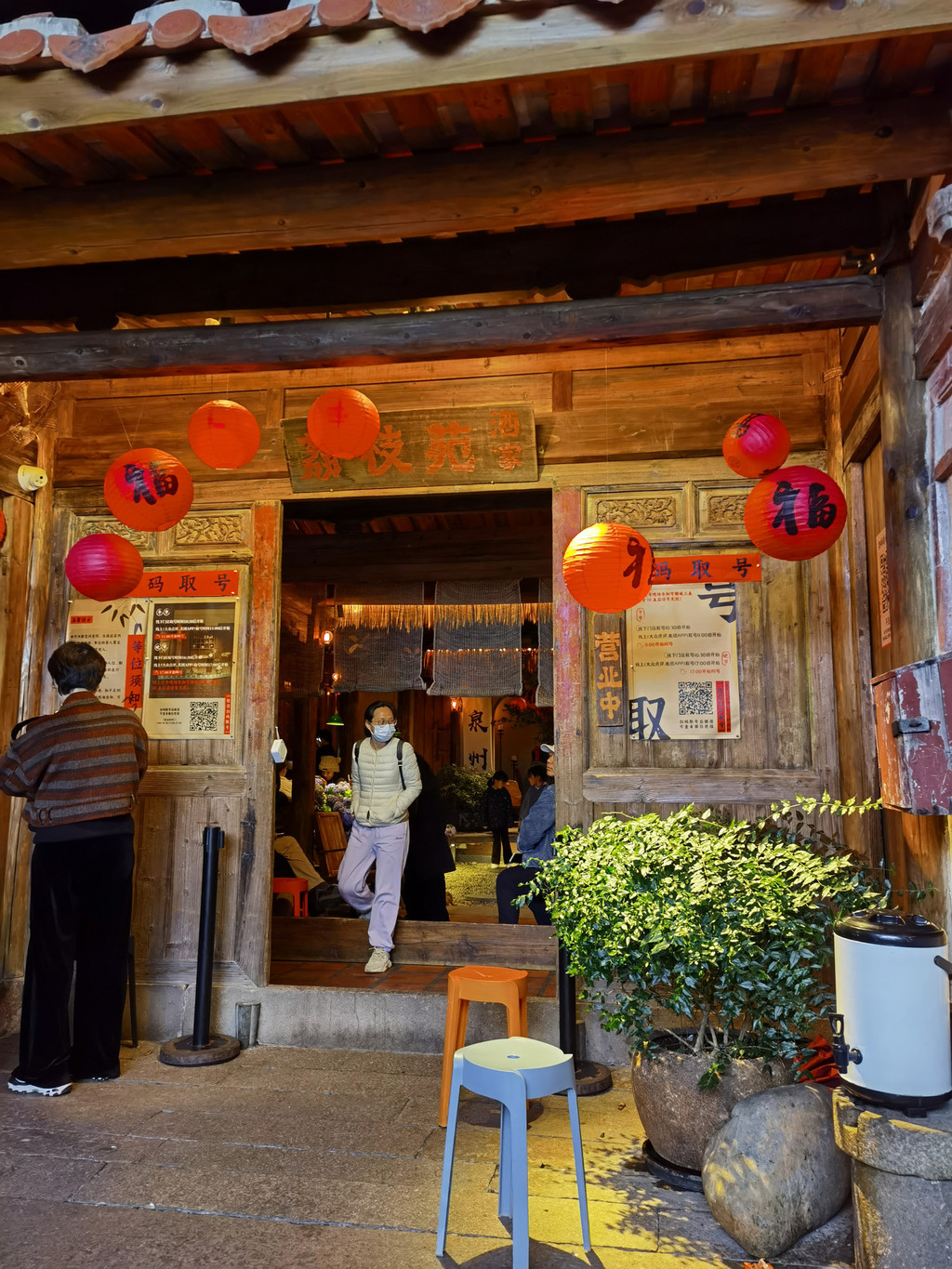 出来天有点蒙蒙黑,正好乘没什么人,可以在这里多拍几张。晚餐选了附近一家比较有特色的”荔枝苑“,好像是网红店,才跨进木门就发现已经很多人在等位。好在有地方可以坐,环境也美美的可以继续拍。