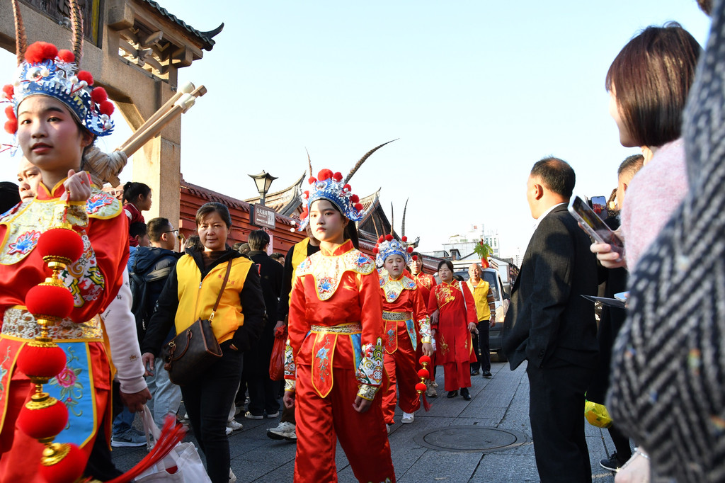 文庙外面的红墙也很出片。正好还遇到了一只高跷表演队。
