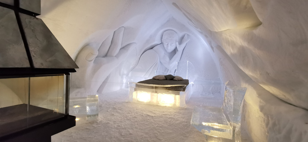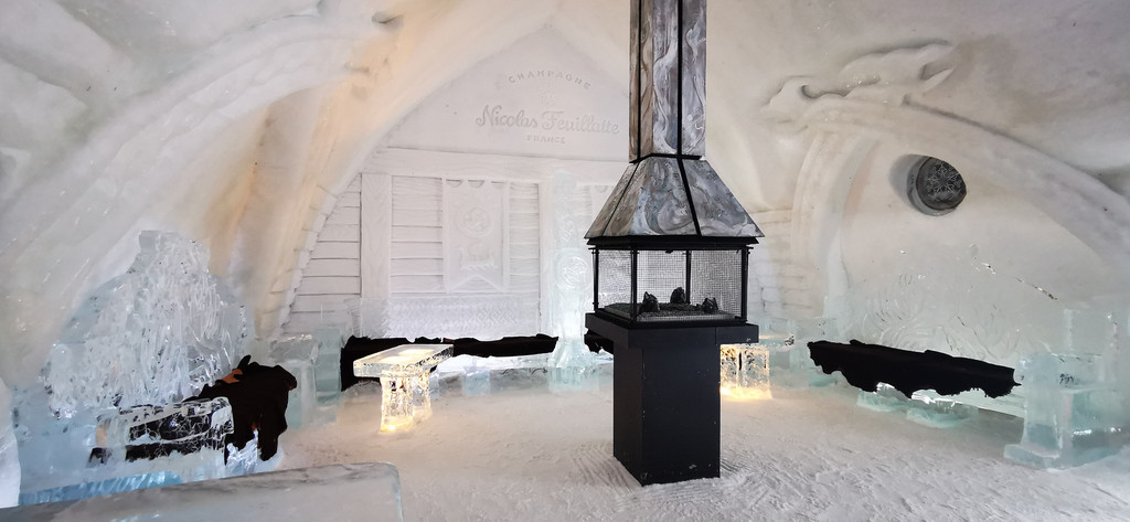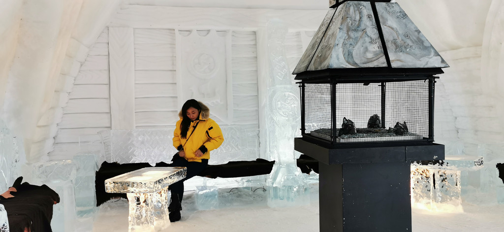 这属于冰酒店的高档客房了,房间里有可以加温的立式壁炉。