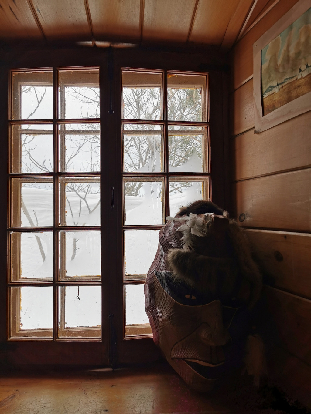 小房子内看向窗外,已经被雪挡了一半的光线。窗内这个硕大的脸谱看上去有些许的印第安风格。