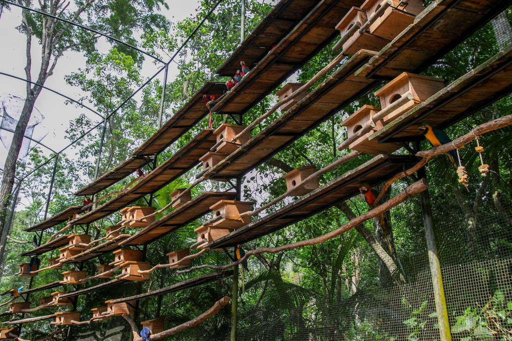 不同于传统动物园的围栏观赏,这里更注重“参与式体验”。游览路线以一条U形小径为主线,途中将穿过6个仿生态大型鸟舍,游客可以走入其间,与金刚鹦鹉、巨嘴鸟、阿拉戈斯冠雉(Alagoas Curassow)等珍禽“零距离接触”。