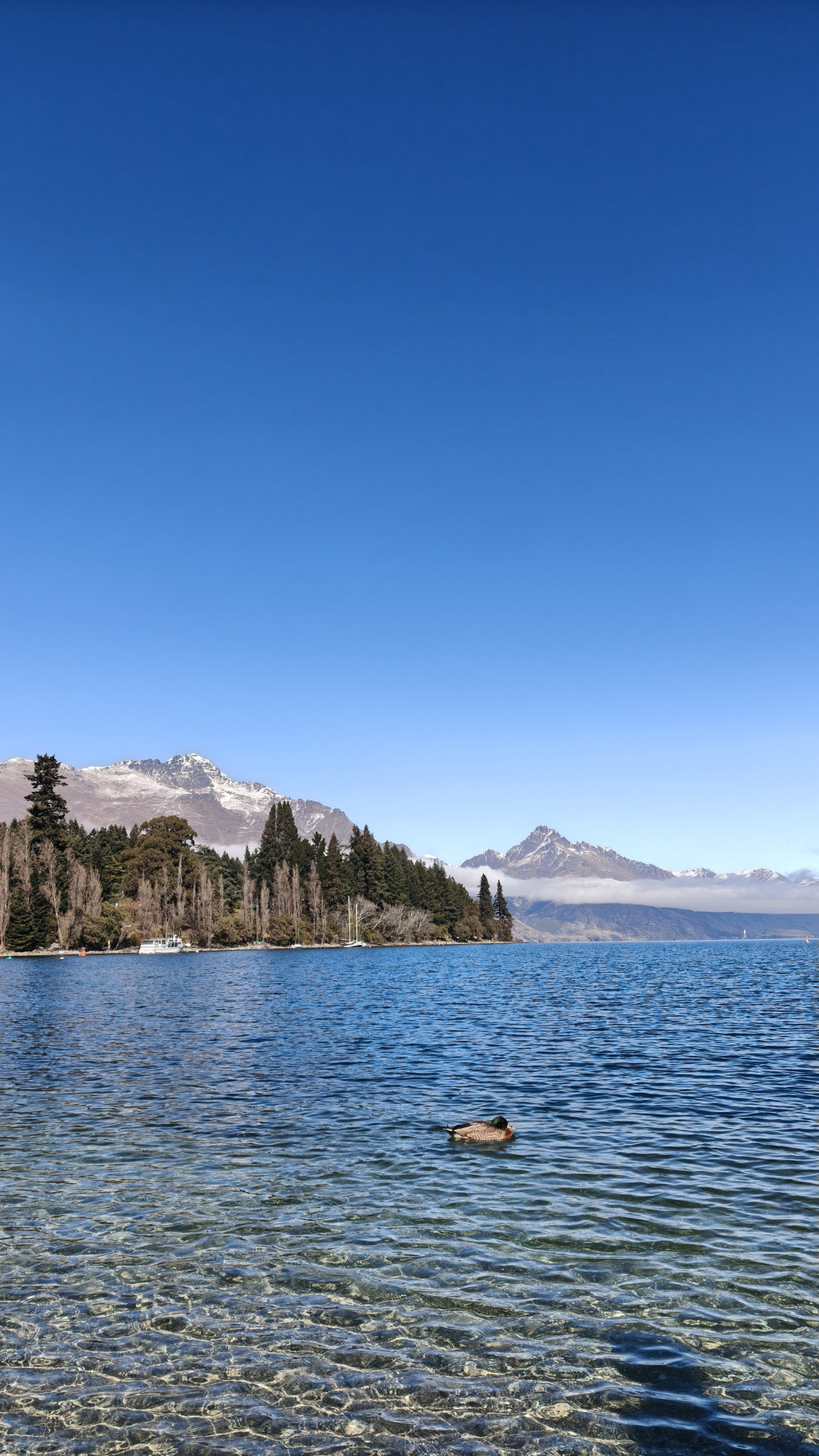 皇后镇的早晨,总是带着惊喜。一早去瓦卡蒂普湖边散步,湖水比想象中更清澈,湛蓝得像一块纯净的宝石,阳光洒在湖面上,泛着粼粼波光;四周围绕着南阿尔卑斯山的壮丽雪峰,峰顶的积雪在晨光下泛着银白的光芒,随着太阳慢慢升高,雪融后又透出淡淡的微红霞光,与湖水相互映衬,构成了一幅绝美的画面。偶尔有水鸟掠过湖面,激起一圈圈涟漪,打破了湖面的平静,却也让这份美多了几分灵动。
