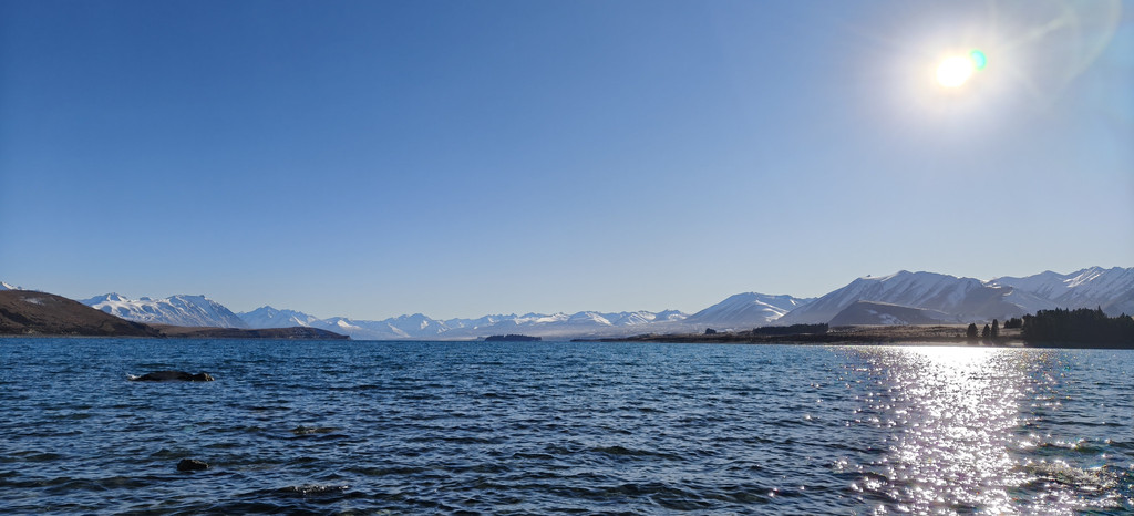 再次来到好牧羊人教堂和特卡波湖边,阳光已经升起,湖水湛蓝得像一块宝石,远处的雪山在阳光下泛着耀眼的光芒,教堂的白色石头建筑在蓝天碧水的映衬下,显得格外圣洁。站在湖边,没有了夜晚的寒冷,只有微风拂过,带着湖水的清凉气息,让人心里格外平静。