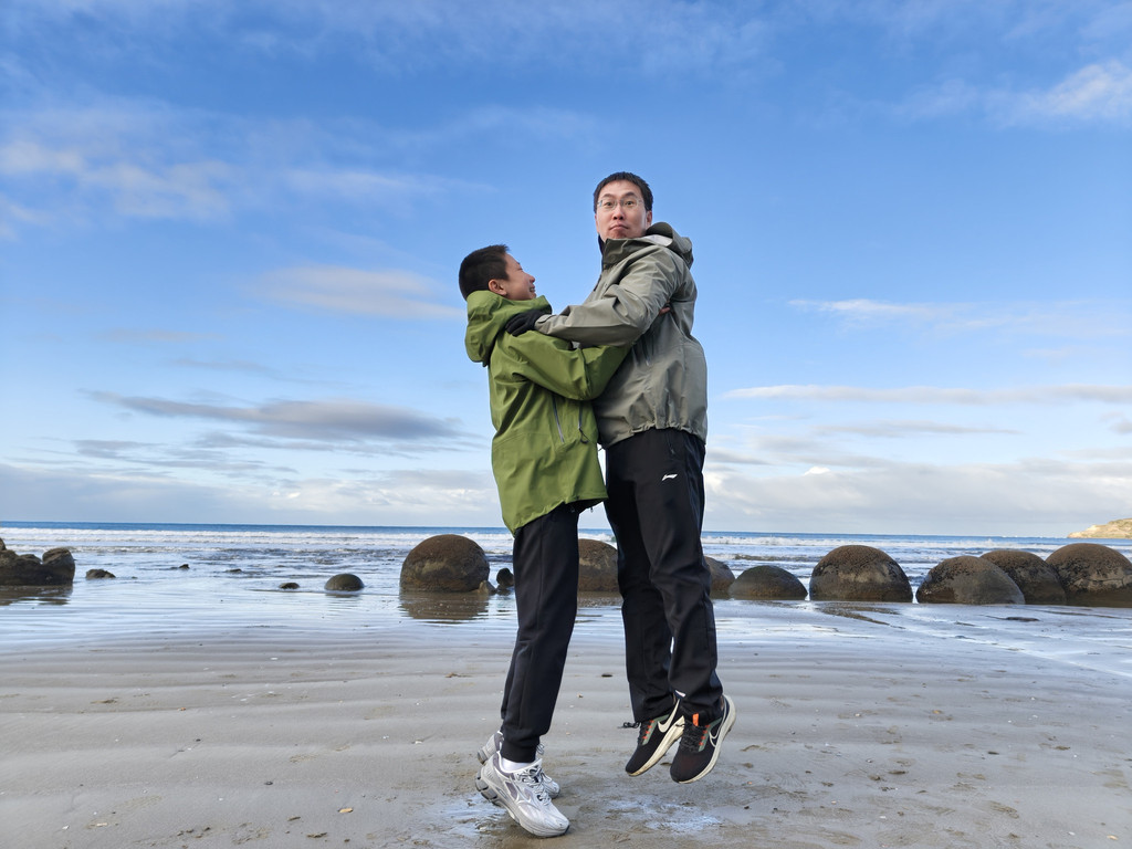下午驱车前往摩拉基大圆石,沿途的风景依旧很美,只是心里多了份期待。抵达时,正好赶上下午的阳光不那么刺眼:几十颗巨型球形石散落在沙滩上,有的完整圆润,有的表面有裂纹,像是从远古时代遗留下来的 “宝石”,静静地躺在海边,被海水冲刷得光滑细腻。据说黄昏时,夕阳的余晖洒在圆石上,会让整个场景变得更奇幻,可惜我们没能等到那个时刻,但光是眼前的景象,已经足够让人惊叹大自然的神奇。