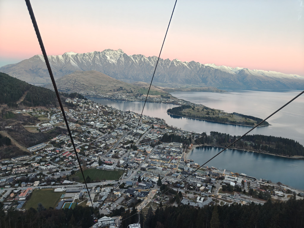 夕阳西下时,我们在鲍勃峰360 度的视野里,皇后镇的房屋错落有致地分布在湖边,瓦卡蒂普湖像一条蓝色的丝带,环绕着小镇,远处的卓越山脉被夕阳染成了金色,雪峰在余晖中泛着微红,整个场景美得让人窒息。一直到太阳完全落下,天空变成淡淡的粉色,我们才舍得离开。