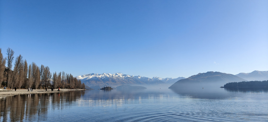 我找了个没人的角落,静静地看着它:柳树的枝条垂在湖面上,随着湖水的波动轻轻摇晃,远处的雪山倒映在湖水中,与树木的倒影重叠在一起,画面格外和谐。清晨的光线不刺眼,湖面像一面镜子,把天空的蓝、雪山的白、树木的绿都映在里面,按下快门的瞬间,仿佛把整个瓦纳卡湖的温柔都装进了照片里。