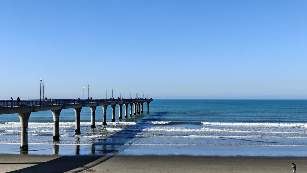 抵达基督城时,离航班起飞还有一段时间,于是决定去新布莱顿海滩看看。海滩上的沙子细腻柔软,踩上去很舒服;栈桥直直地伸入海中,像一条通往大海的路,站在栈桥上,能看到远处的海平线,海水湛蓝,天空清澈,偶尔有海鸥飞过,画面格外治愈。