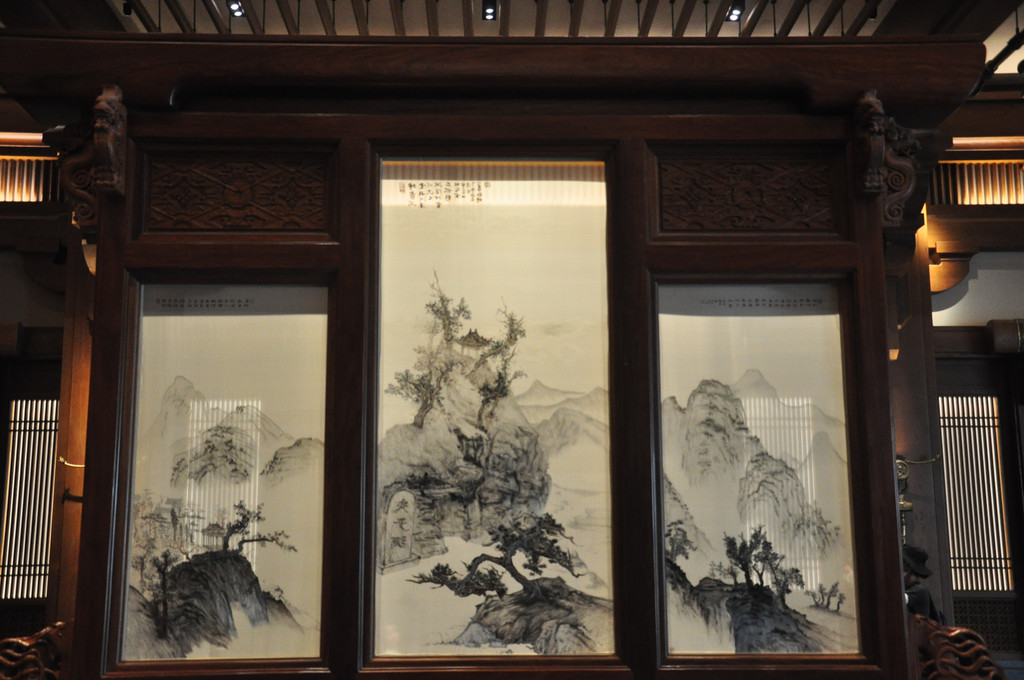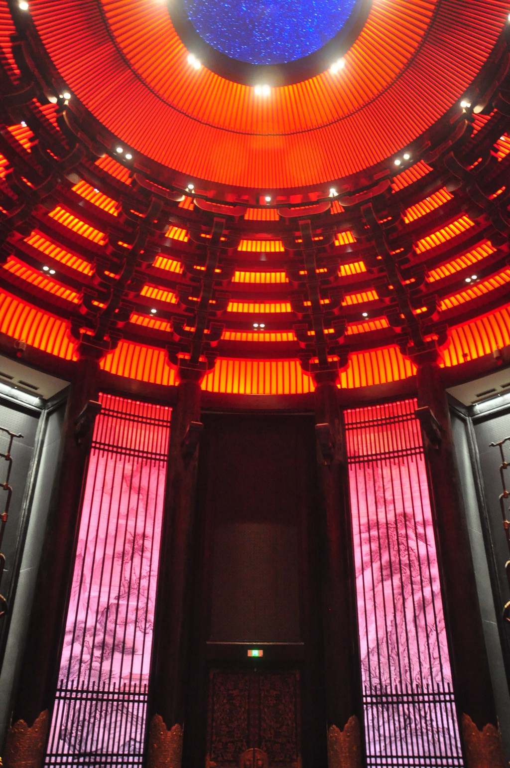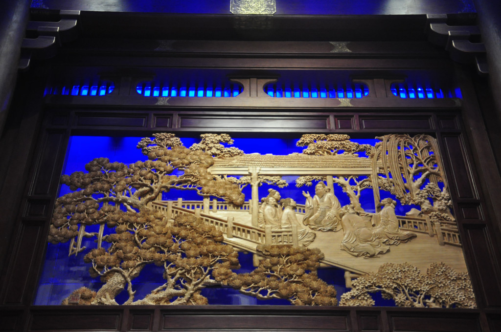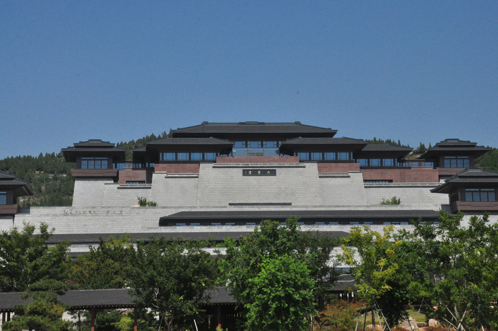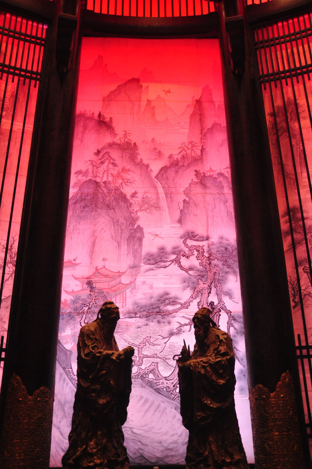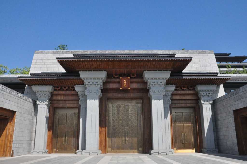 大学堂依山而建,整体呈退台式形制,儒家思想智慧与现代建筑艺术结合,包含集贤厅、大学之道、七十二贤廊、仁厅、义厅、礼厅、智厅、信厅、礼乐堂等有序的、仪式化的文化空间。大学堂是文化的学堂、艺术的殿堂,通过东阳木雕、山西泥塑、苏州刺绣、福州漆画、景德镇陶瓷画等中国传统艺术经典之作,表达不同的文化主题。大学堂内部的确让人耳目一新,表现不凡,出乎想象。那个豪大,那个精致,那么富丽堂皇,用一震撼来表述也不为过。我们在此停留的最久,流连忘返。