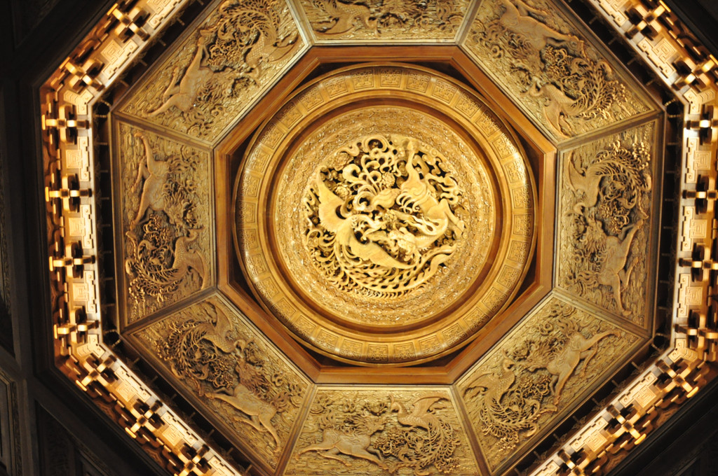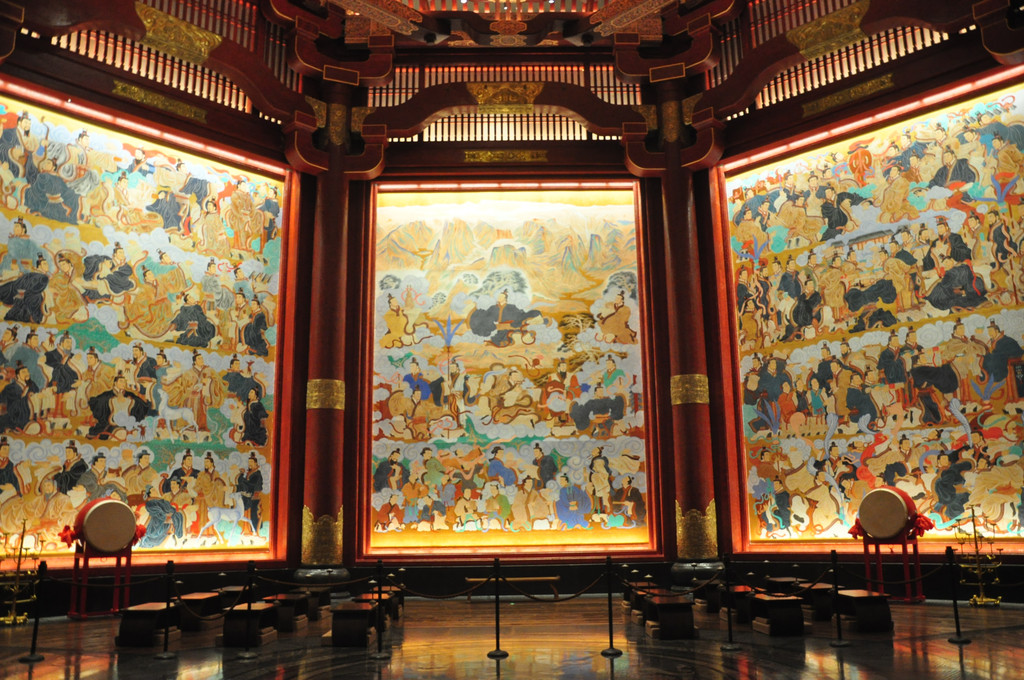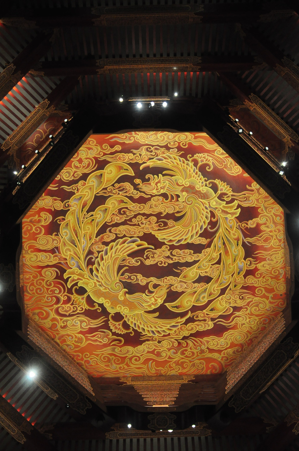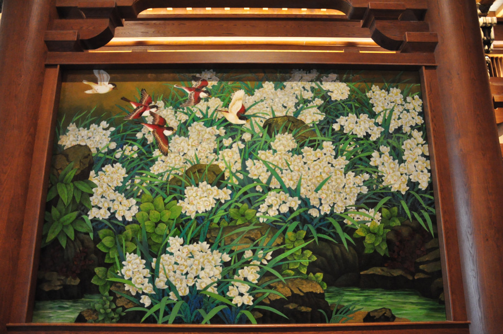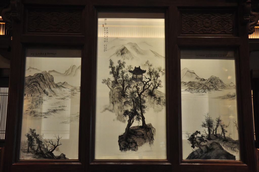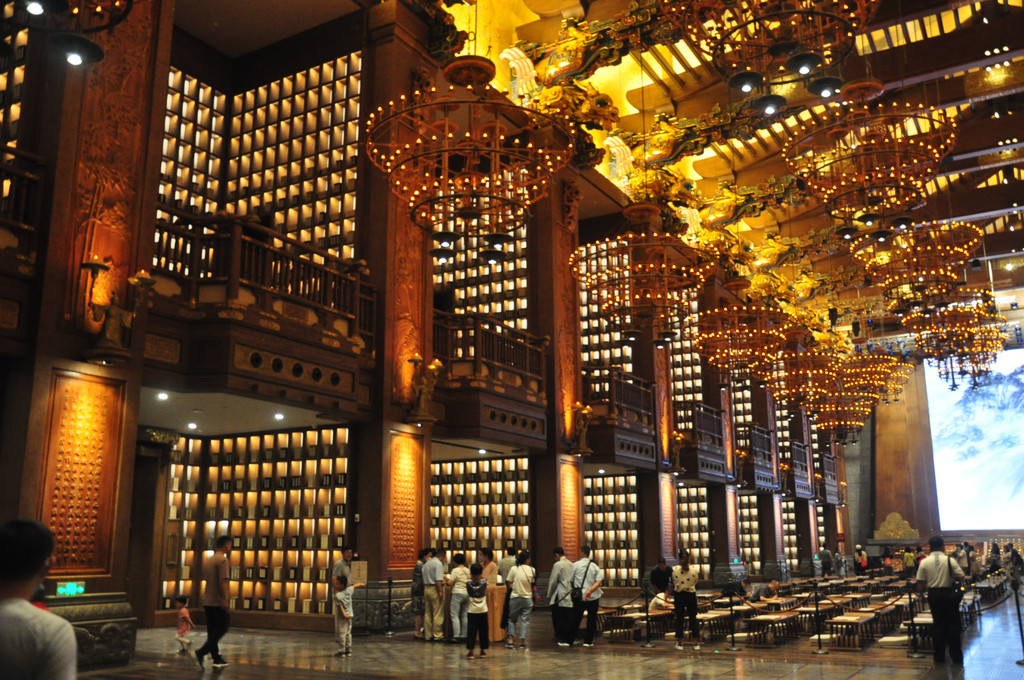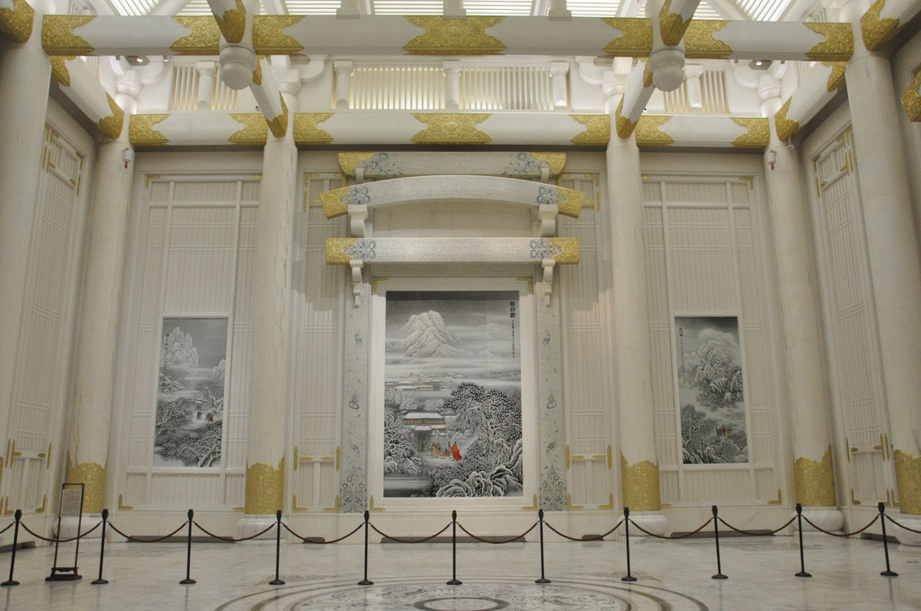 大学堂依山而建,整体呈退台式形制,儒家思想智慧与现代建筑艺术结合,包含集贤厅、大学之道、七十二贤廊、仁厅、义厅、礼厅、智厅、信厅、礼乐堂等有序的、仪式化的文化空间。大学堂是文化的学堂、艺术的殿堂,通过东阳木雕、山西泥塑、苏州刺绣、福州漆画、景德镇陶瓷画等中国传统艺术经典之作,表达不同的文化主题。大学堂内部的确让人耳目一新,表现不凡,出乎想象。那个豪大,那个精致,那么富丽堂皇,用一震撼来表述也不为过。我们在此停留的最久,流连忘返。