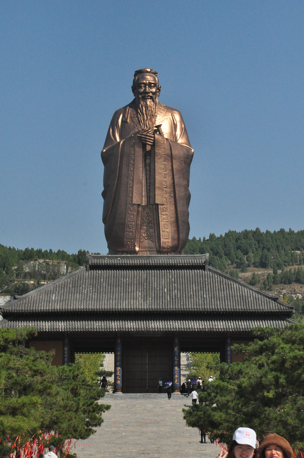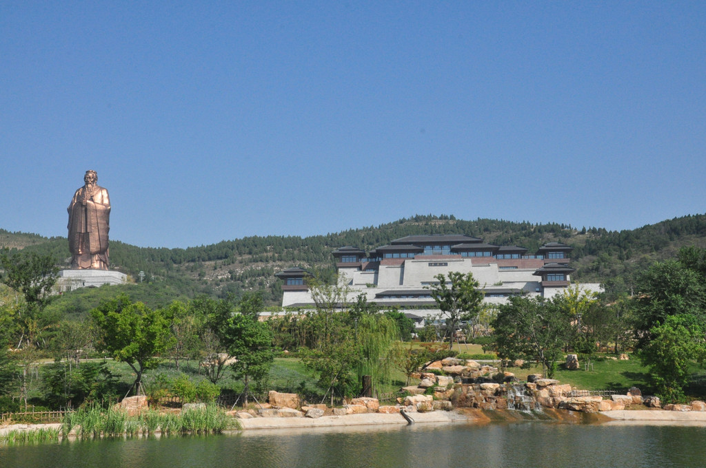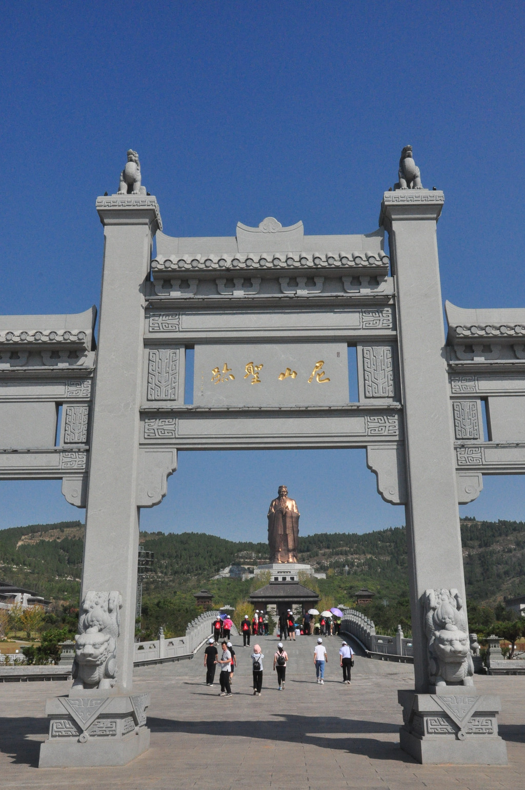 孔子像,高72米,由著名雕塑家吴显林先生主持设计,以唐代画家吴道子《先师孔子行教图》为参考,按照"可亲、可敬"、"师者、长者、智者"的形象定位进行塑造,统领尼山圣境文化空间制高点。但是,孔子像下底座内工程还没有完成,无法进入上达孔子像内观赏,是一遗憾。