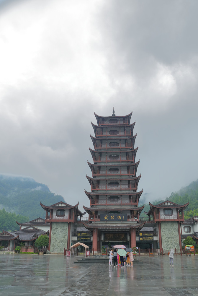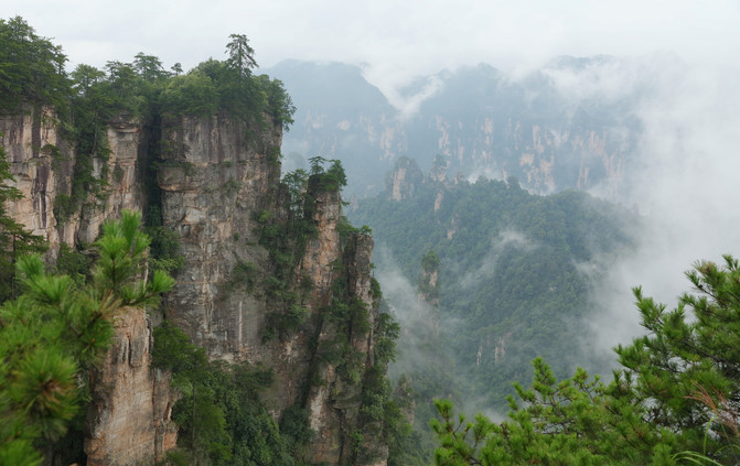 南门以前是主要出入口,从张家界市过来走这个门最近,后来武陵源发展起来,因进公园后就是车站,可乘车到各处,武陵源标志门就成了主门。从南门出来看到路边的饭店商铺门可罗雀,而且这边山多平地少,不好开发。叫了网约车,开车的小伙子是本地土家族人,很自豪地说他们这里的山都很美,处处有奇景,公园里不过是集中些罢了,山上没有土,却能长出植物。说起家里自制的腊肉,他说每年大多数人家会养头猪,入冬前杀了做腊肉,往往能吃大半年,不够的就要到市场上买了,买的制作简化,味道差不少。最后一天再次冒雨从天子山索道上山去杨家界,第一天下山时没在意,上山可体会到爬索道台阶之苦了,所以乘索道最好是下山,上山还是天梯省力。上山后乘车到点将台,雨一直在下,云雾飘忽不定,时浓时淡,一会儿眼前一片白茫茫,一会儿石柱露出头,一会儿露出腰,一对上海老夫妇说他们在这里呆了快一个小时了,看不够。
