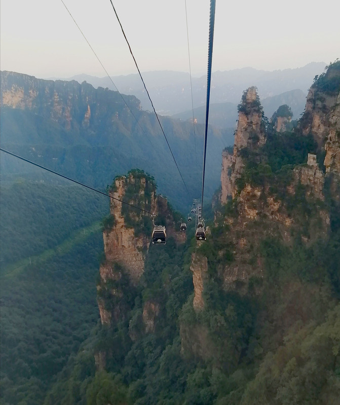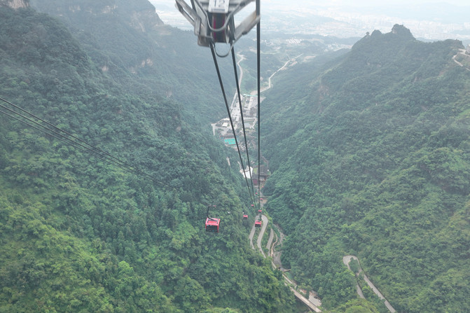 我们在武陵源住了三晚,有两个整天两个半天时间,除了刚到那天是个晴天,后几天都阴雨蒙蒙。用了中间一整天去天门山国家森林公园,278元的门票包括索道。到张家界市区的大索道下站一路畅通,但限速基本在60公里,所以用了近一小时。到的比较早,停车、买票都挺顺利,然后就绕来绕去找索道入口,不知怎么设计的,明明一个建筑,偏要让人出来绕着楼转半圈再进去,入口在二楼,看谁跑得快谁就能排在前面,队伍曲里拐弯地在大厅里盘绕着、蠕动着,看着窗外天门山方向一片白茫茫,上了缆车仿佛置身天上,轿厢整个被雾包裹,偶尔隐隐露出一点地面或山体,剩下的只能看见头上的缆绳,恐高的人可以放松些了。