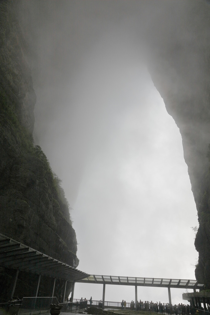 从大索道上站可向东或向西走,两边各有一段玻璃栈道,雾实在太大,透过玻璃也看不到什么,我们没走,摸瞎把两边的栈道都走过,从东边向下坐七节长滚梯就到了天门洞,天门洞再向下是天梯,也可自费32元乘电梯下去,再乘快索就到山下了。这段时间通天大道不开放,不能体验盘山路的刺激。天门山只有天门洞这一个自然奇观,其余都是人工修建,线路也是规划好的,没有什么自由发挥的余地。本来可以从不同角度看天门,赶上大雾什么都看不见。听当地人说山上一年中没几天是晴天,即便山下晴山上多半也是雾,带摄影团的导游都有山上的线人,打电话问清楚了山上没雾赶紧带人上山。天门山是极限运动的天堂,每年都有世界各地的挑战者前来冒险,翼装、摩托车、赛车等。个人感觉景色远没有张家界多姿多彩。