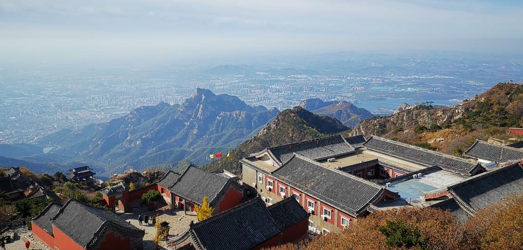 网上找了一张岱庙全景图,沿岱庙的中轴线,出大门,正前方即是泰山主峰。