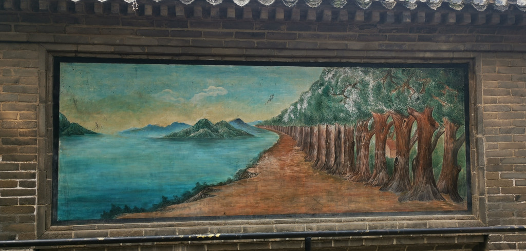 在孔府花园角门处,有幅出自清末一位不知名画家之手的壁画,画面上有一条大路、一排高树,朝观者而来。画家巧用边与角的视觉效应,使游者不论站在东、南、北哪个方向,都觉的正对着这条路的中央,十分有趣