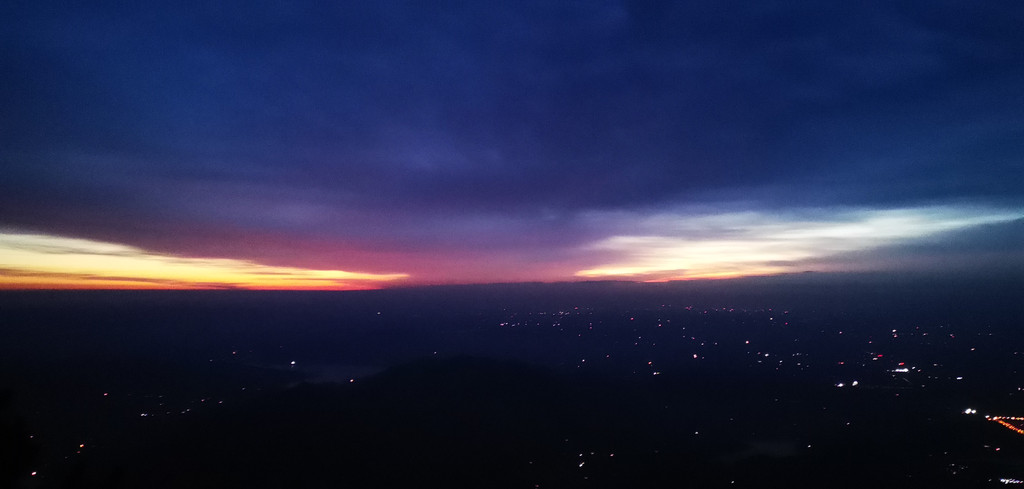 深青色的天空下,霞光两边散射,大地灯光点点,似满天星星,日出之前,万丈风采,独领风骚!