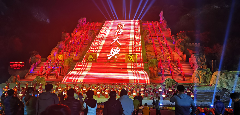 封禅大典门前广场,背景是天烛峰,上有“中华泰山 封禅大典”八个大字。