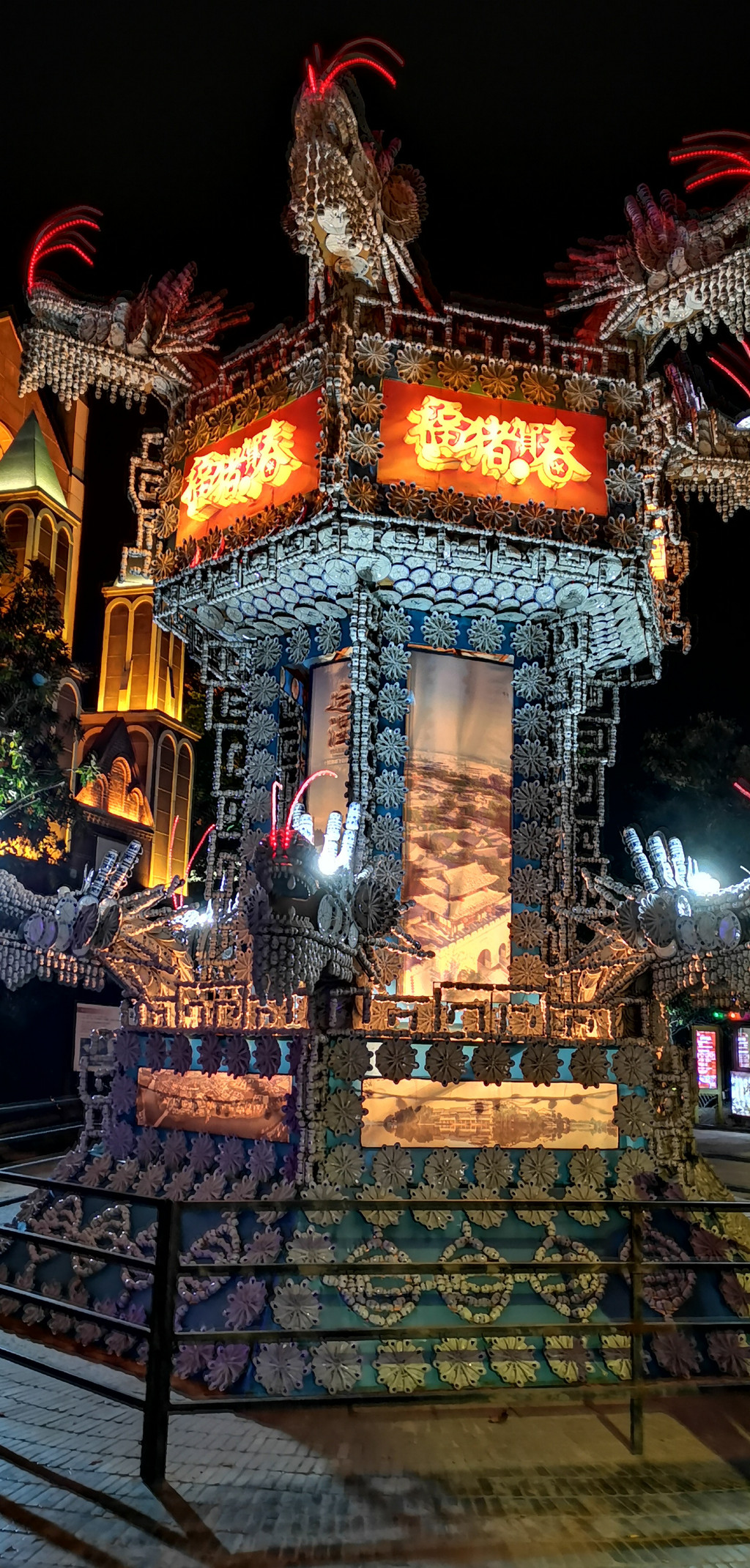 路中间“福猪贺春”花灯,多种磁器拼接而成,工艺繁杂、精美。