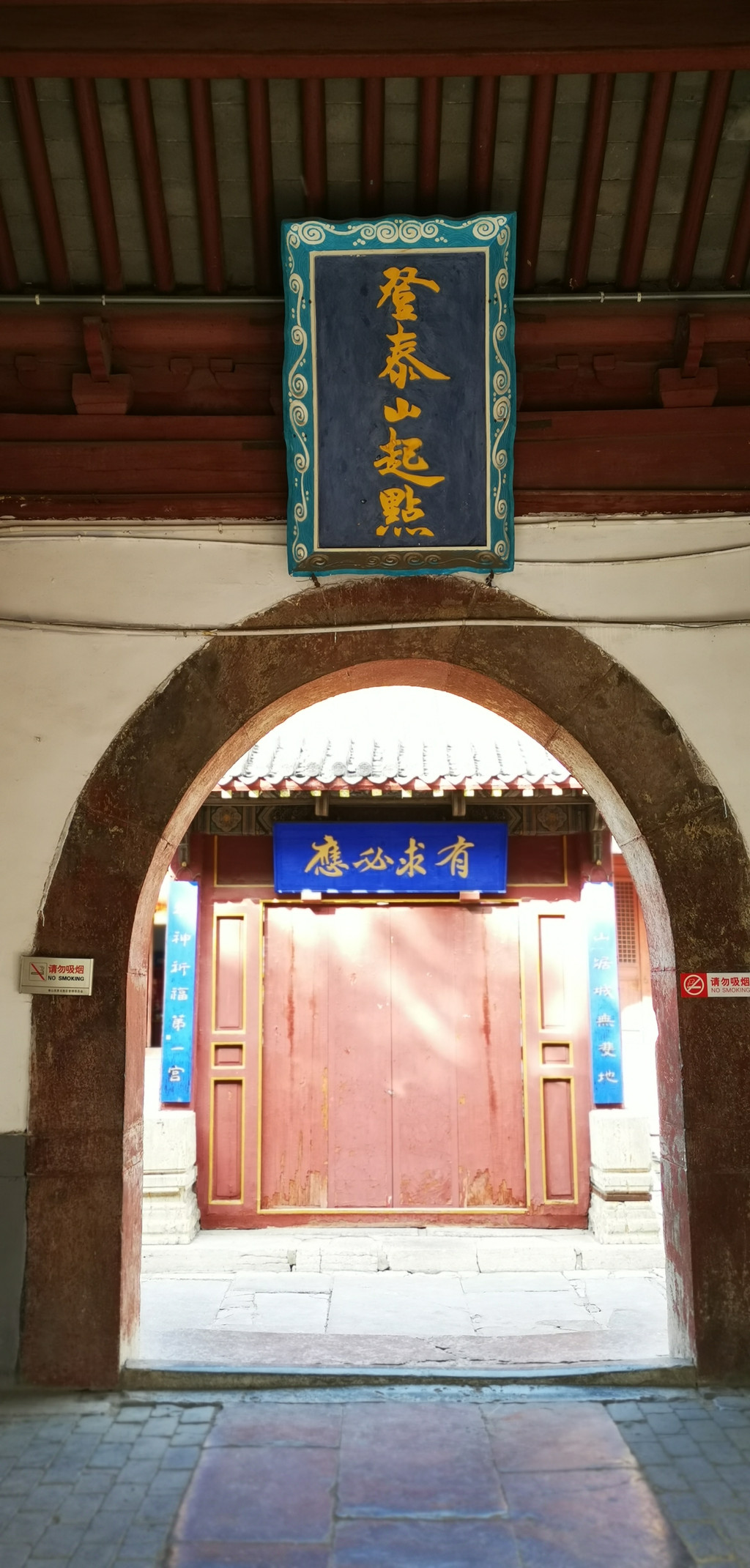 遥参亭三门牌坊,后面是泰山第一行宫。