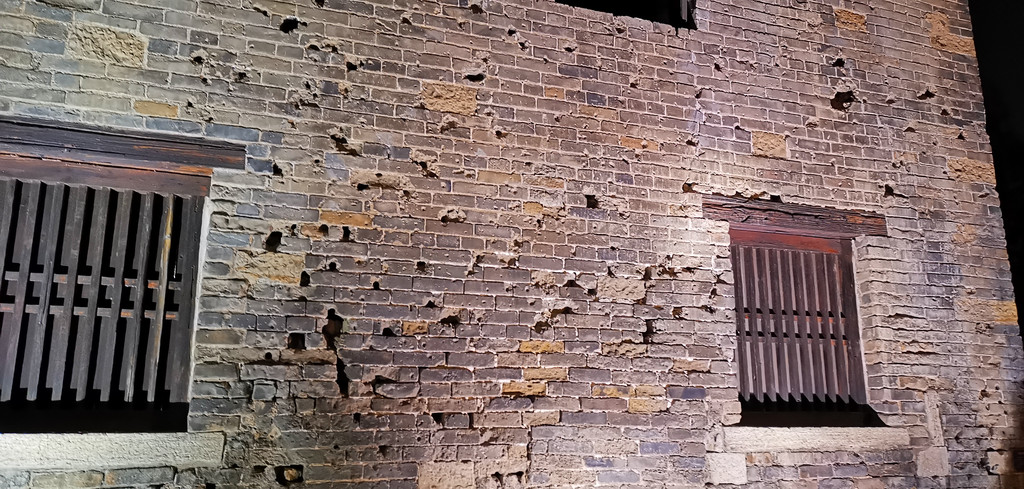 在台儿庄大战遗址公园里,墙上的洞窟都是当年留下的枪眼和弹痕。