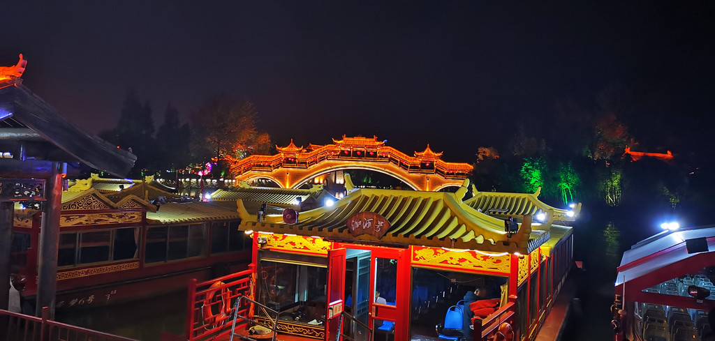五行亭和步云廊桥,天色暗,声光效果更佳,建筑轮廓明显,人在水中游,景往船后走,只是除了灯光映衬,其它啥也看不清。