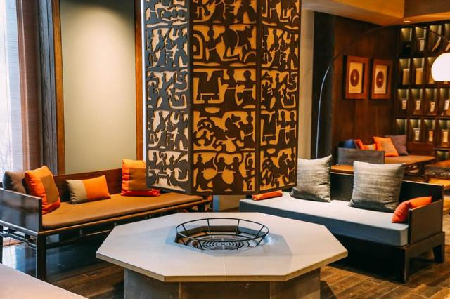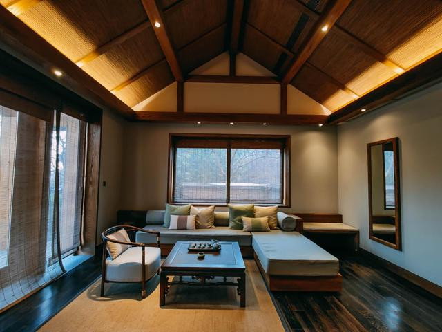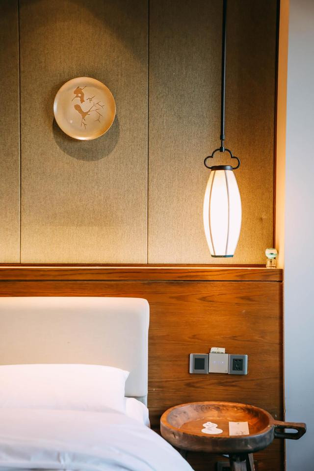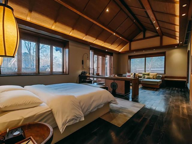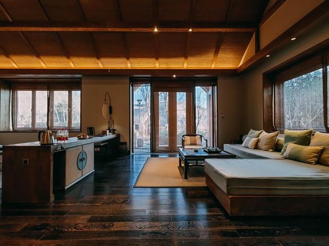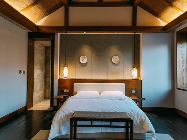 古色古香的中式客房、墨香下的书桌与竹简、毫不刻意的文化氛围,柔软舒适的居住环境,足以冲散倦怠。在这里,喧嚣的都市生活暂时变成了归园田居般的小隐生活,酒店内还配有泳池、健身房、徒步跑道等现代化公共设施使居住环境贴近自然而不与时代脱轨。