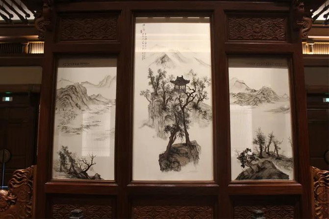 走进去后激动不已!怎么可以如此繁华,随处都是奢华精致建筑,大学堂的迎宾大厅,最先看到的是纯手工打造的双面刺绣,在灯光的照射下显得薄如蝉翼,但刺绣的一针一线又显得那么的生动传神,最震撼看着有一层玻璃即视感但是并没有玻璃。