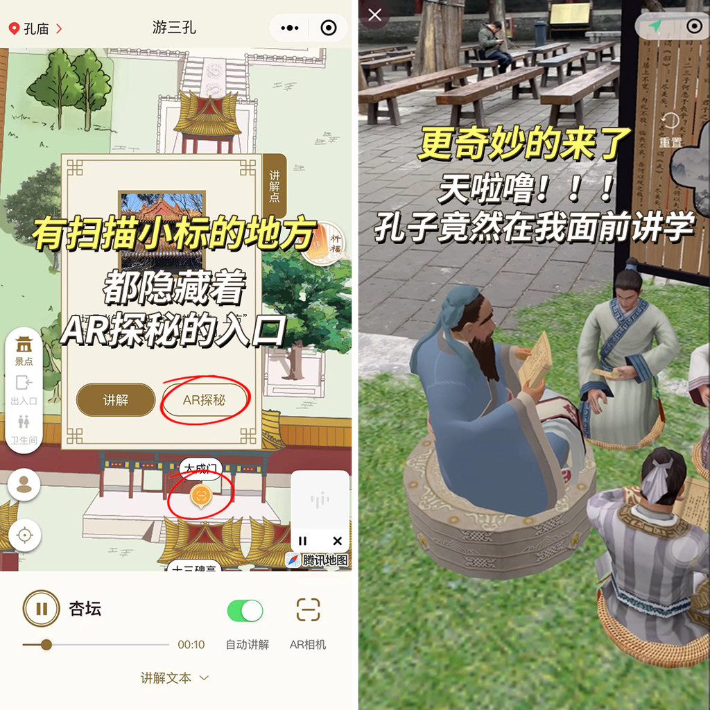 杏坛是为了纪念孔子讲学而建,孔子第四十五代孙孔道辅监修孔庙时,将正殿后移,除地为坛,环植以杏,名曰“杏坛”,杏坛是孔子教育光辉的象征。“游三孔”导览在这还能进行AR祈福的,我也许下了新的愿望。