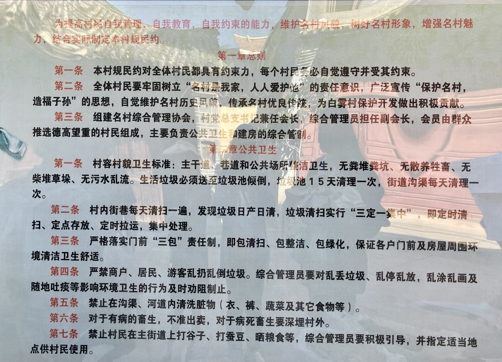 白雾村的村规特别有趣,定好如何轮流做公共清洁,如何爱护环境,村民积极参与,也正是这优美的自然风光与绚丽的人文景观吸引了大量的游客前来观光,最多的时一天有一两万人来此寻访,还有些喜欢安静的人过来旅居,一呆就是几个月。