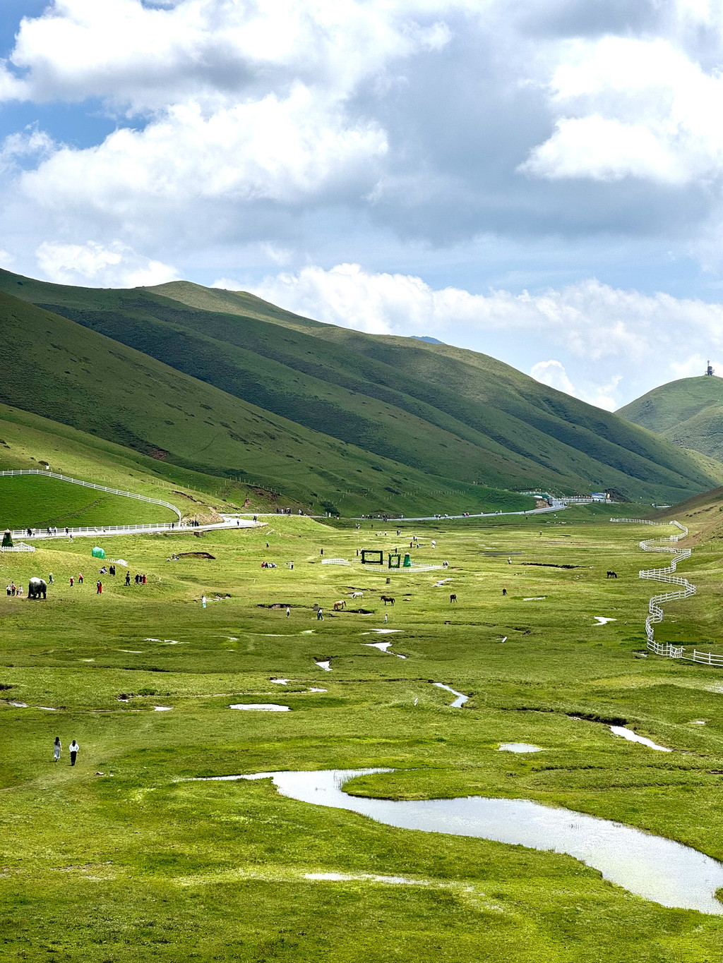 我忍不住躺了下去,碧草如茵,绵延至天边,与蓝天白云相接,清风袭来,凉意四起。于此,能静心欣赏骏马与绵羊悠闲漫步,对于蒸煮已久的我们来说,心中感恩着大自然的恩赐。