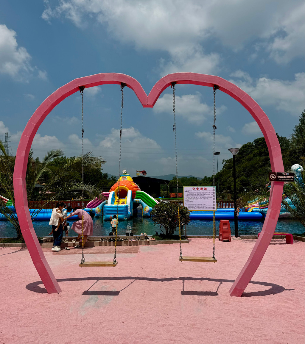 景区的负责人张远棋夫妻是东北人,脑洞很大,很会来事。园区内30个露天温泉泡池错落有致,植被环绕,各具特色,既保证了私密性,又让人仿佛置身于大自然的怀抱,张老板还精心打造了激情水上冲浪、温泉蹦迪广场、泡泡温泉大作战等特色项目,儿童戏水池、大型冲浪池、无动力乐园、露天游泳池里都是不知愁的人们,很嗨,他们以恒定45°C的天然温泉做新陈代谢的良药,怪不得个个这么热情,精力旺盛。而户外攀爬、大秋千、篝火晚会等项目能让全家老小齐上阵。