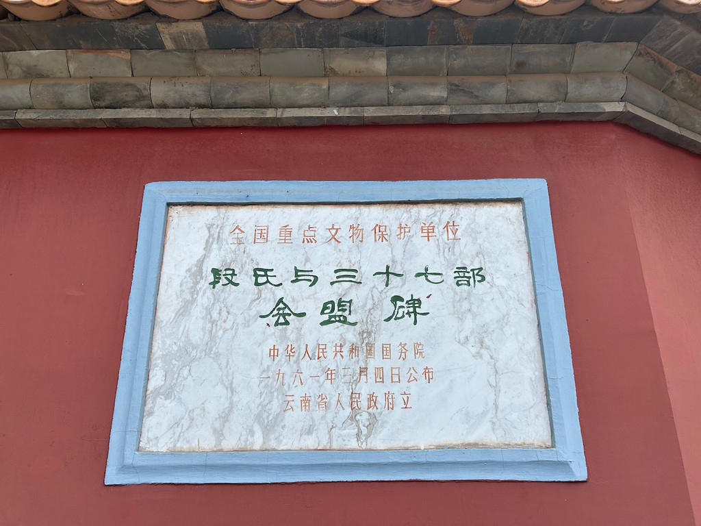 段氏与三十七部会盟碑,记录大理国段氏政权与滇东乌蛮三十七部在石城(曲靖)歃血盟誓,是见证云南历史的实物。不过此碑风化严重,好多字看不清了。