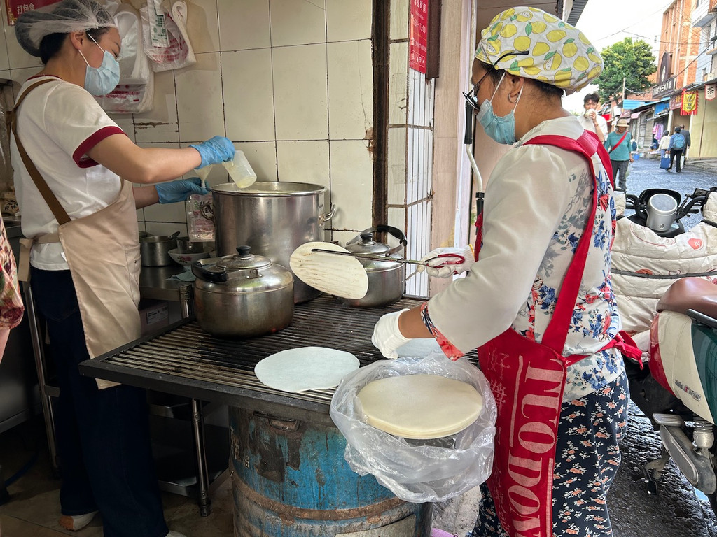 烤饵块的女师傅功夫了得,在门口的大铁桶炉子上烤,烤好一块一甩,刚好甩到2米外的桌上。另外一个服务员再刷上好几种调料。