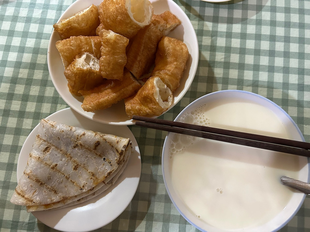 豆浆很新鲜,早晨刚做好的,用大不锈钢罐子煮着,散发浓郁豆香。油条炸得够透、够脆,油沥得干净,多年没吃过这么好的油条了。