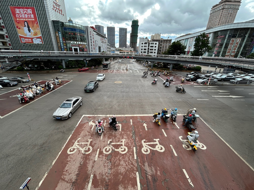 曲靖的道路交通线设计与众不同,十字路口的电单车都挺守规矩。原来,主要街口有交警在一旁监督着。